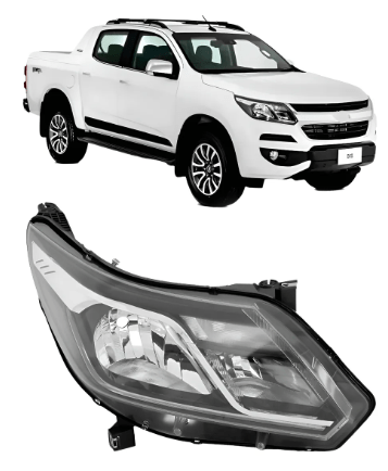 O farol direito para a Chevrolet S10 e Trailblazer dos anos de 2017 a 2024, com LED diurno e friso cromado, possui foco duplo e utiliza lampadas dos tipos H1 (farol alto) e H7 (farol baixo).
