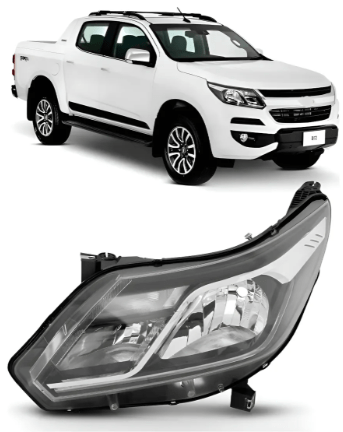 O farol esquerdo para a Chevrolet S10 e Trailblazer dos anos de 2017 a 2024, com LED diurno e friso cromado, possui foco duplo e utiliza lampadas dos tipos H1 (farol alto) e H7 (farol baixo).