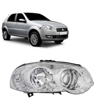 O farol com "canhao cromado" e mascara cromada para o lado direito (passageiro) do Fiat Palio dos anos 2010 a 2012 e um modelo de foco duplo com o design padrao original, ideal para reposicao em veiculos que buscam manter a estetica de fabrica.