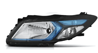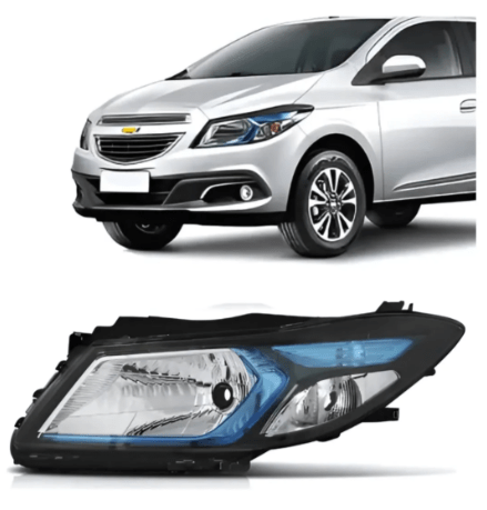 O farol principal cromado com mascara/moldura azul lado esquerdo e compativel com o Chevrolet Onix e Chevrolet Prisma dos anos de 2013 ate 2018, sendo um modelo de foco simples que utiliza lampada H4.