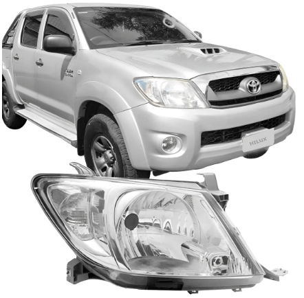 O farol direito cromado para a Toyota Hilux dos anos 2009 a 2011 e compativel com os modelos SR e SRV, possui lente de acrilico e utiliza lampada H4.