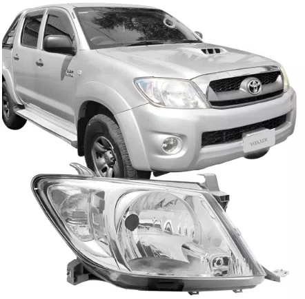 O produto serve como peca de reposicao para substituicao de farois danificados, amarelados ou para renovacao estetica da dianteira dos veiculos Toyota Hilux e Hilux SW4 fabricados entre 2009 e 2011.