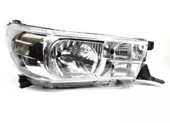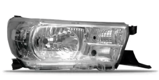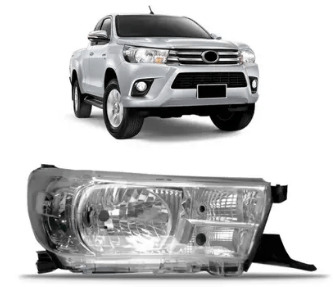 O farol direito (passageiro) para a Toyota Hilux de 2016 a 2020, modelo simples (sem LED), possui foco simples e mascara cromada, e o nome "Hilux" pode estar gravado na carcaca ou lente, dependendo do fabricante (geralmente em pecas originais ou de reposicao de alta qualidade).