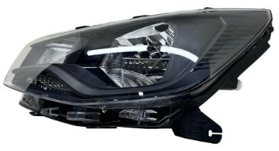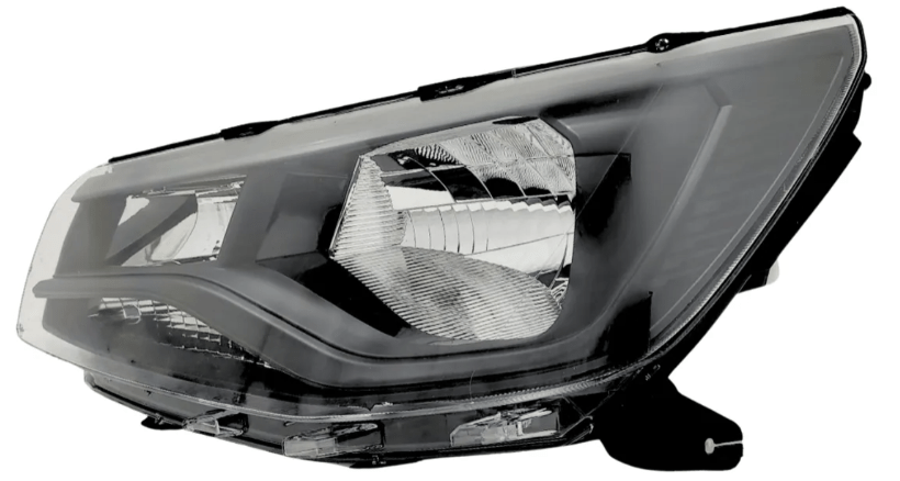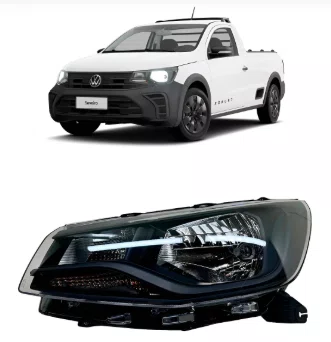 O farol esquerdo para a Volkswagen Saveiro Robust G9 (modelos 2023 a 2025) possui friso preto e e uma peca de reposicao original ou compativel, projetada para o lado do motorista.