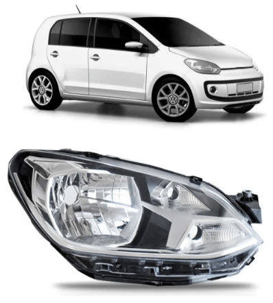 O farol Volkswagen UP com friso cromado para os anos de 2017 a 2021, lado direito (passageiro), possui foco simples, utiliza lampadas H4 e e feito com lente de acrilico resistente.